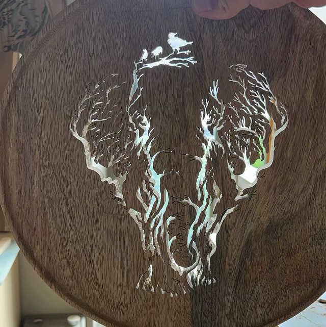 Loup pyrogravure ≈65x45cm cadre chantourné